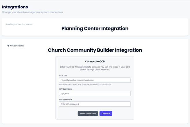 - Make sure your ChMS API credentials are active and correct before connecting the integration.