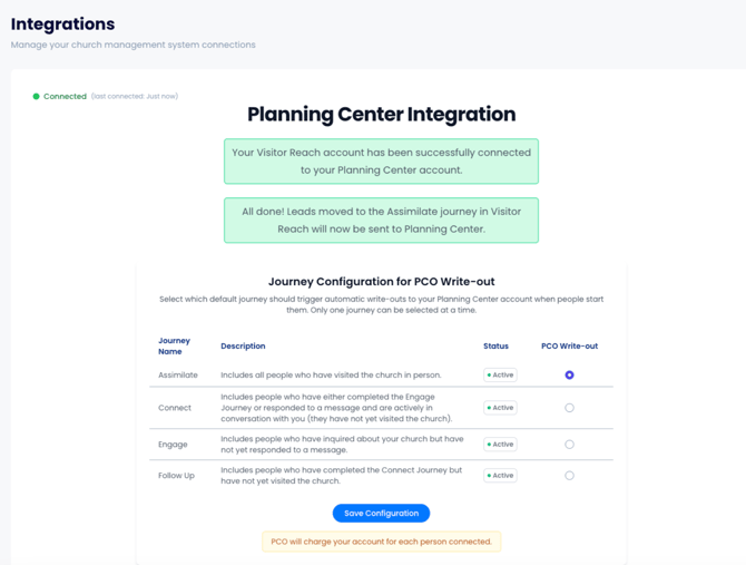 Integrating Planning Center with VisitorReach allows you to automatically send people into your PCO system when they are added to a Journey.