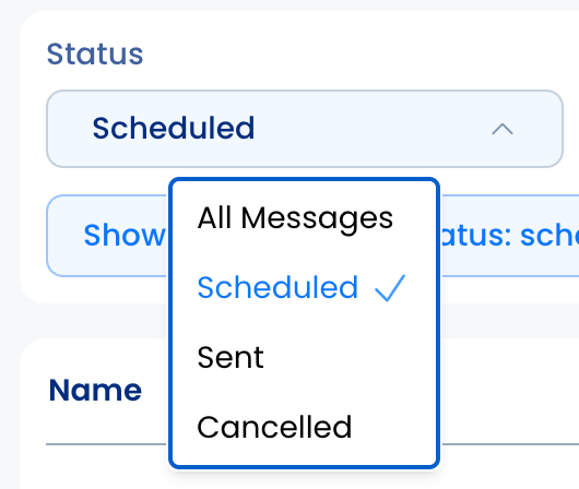 - Under Status, you are able to view all scheduled, sent, or cancelled messages.