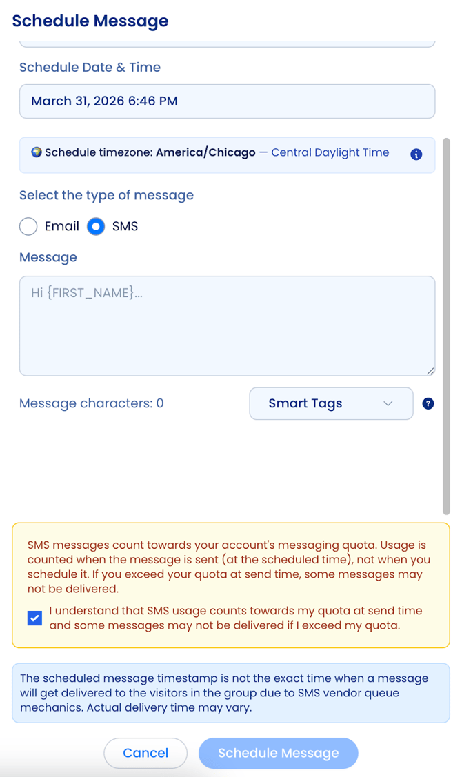 - SMS Messages: Due to texting regulations, messages can only be scheduled between 9:00 AM – 8:00 PM.